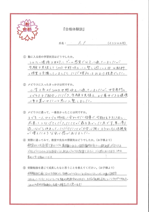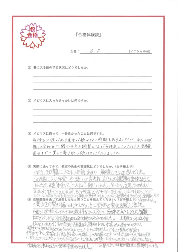 メビウスに通って一番良かったことは、子ども一人ひとりの特性に合わせた指導で、可能性を引き出し、成果に繋げてくださったことが最も良かった点です。常に寄り添いながら伴走していただけたことが大変心強く、もう4〜5人保護者が増えたような安心感がありました。