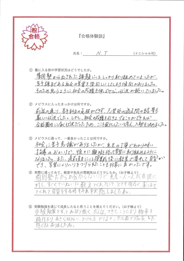 社会に苦手意識がありましたが、先生の丁寧でわかりやすい指導のおかげで、徐々に興味を持って学習に取り組めるようになりました。また、直前期には授業前後に教室で集中して自習ができ、学習にメリハリをつけられたことも非常に良かったです。